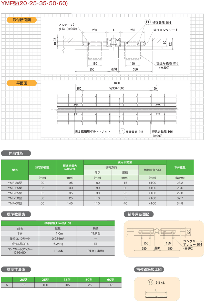 スムースジョイントYMF型は、ゴムと鋼材を一体加硫成形し、車輌通過時の衝撃をゴム弾性で効率よく吸収し、荷重を内蔵鋼板で受ける構造となっている荷重支持型ジョイントです。